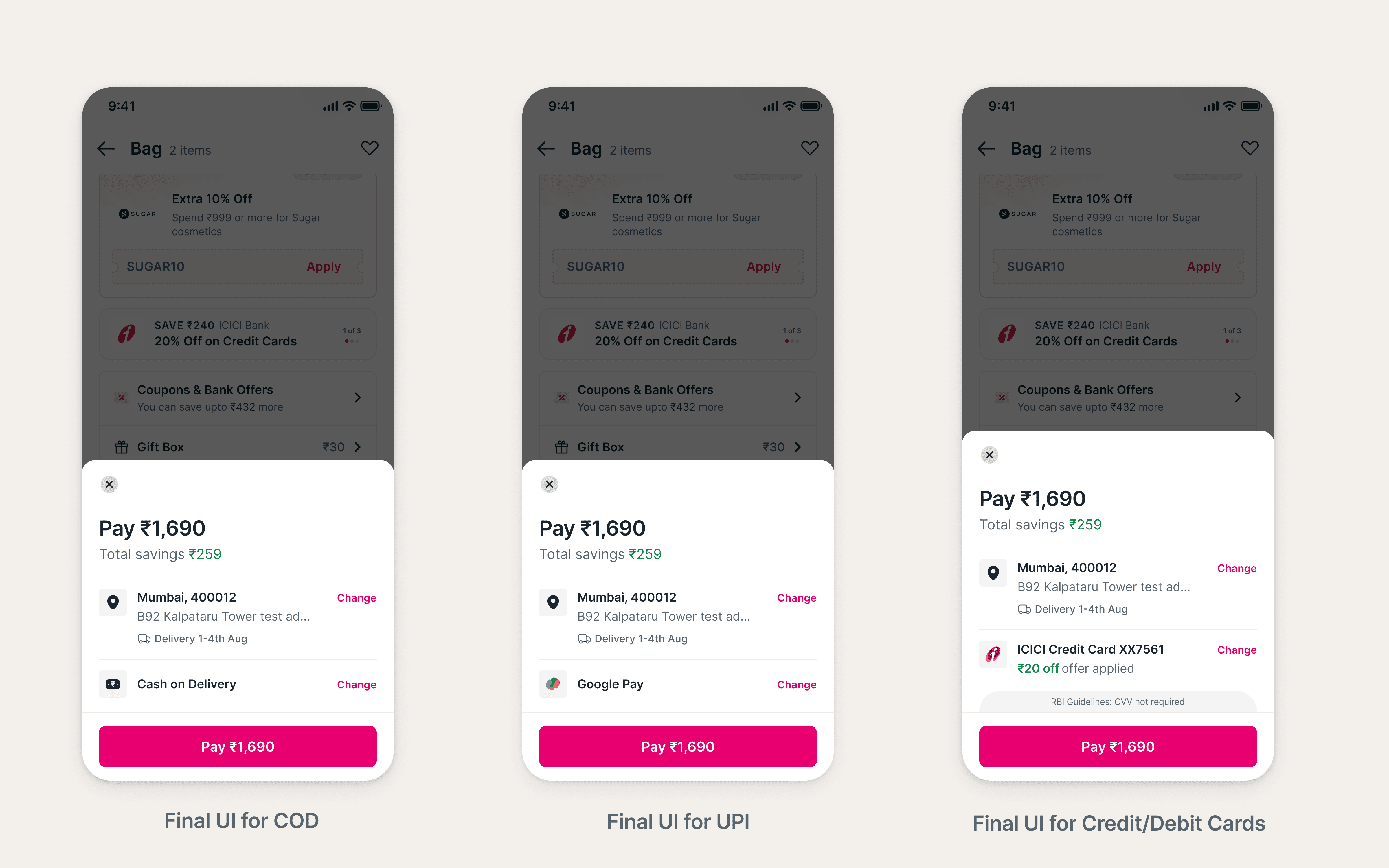 We leveraged the competitor patterns to design a clear, scalable Express Checkout UI that highlighted preselected address and payment details. Multiple iterations accounted for edge cases like auto-applied payment offers, CVV not required messaging for saved cards, and alert for COD fees before launching the MVP.
