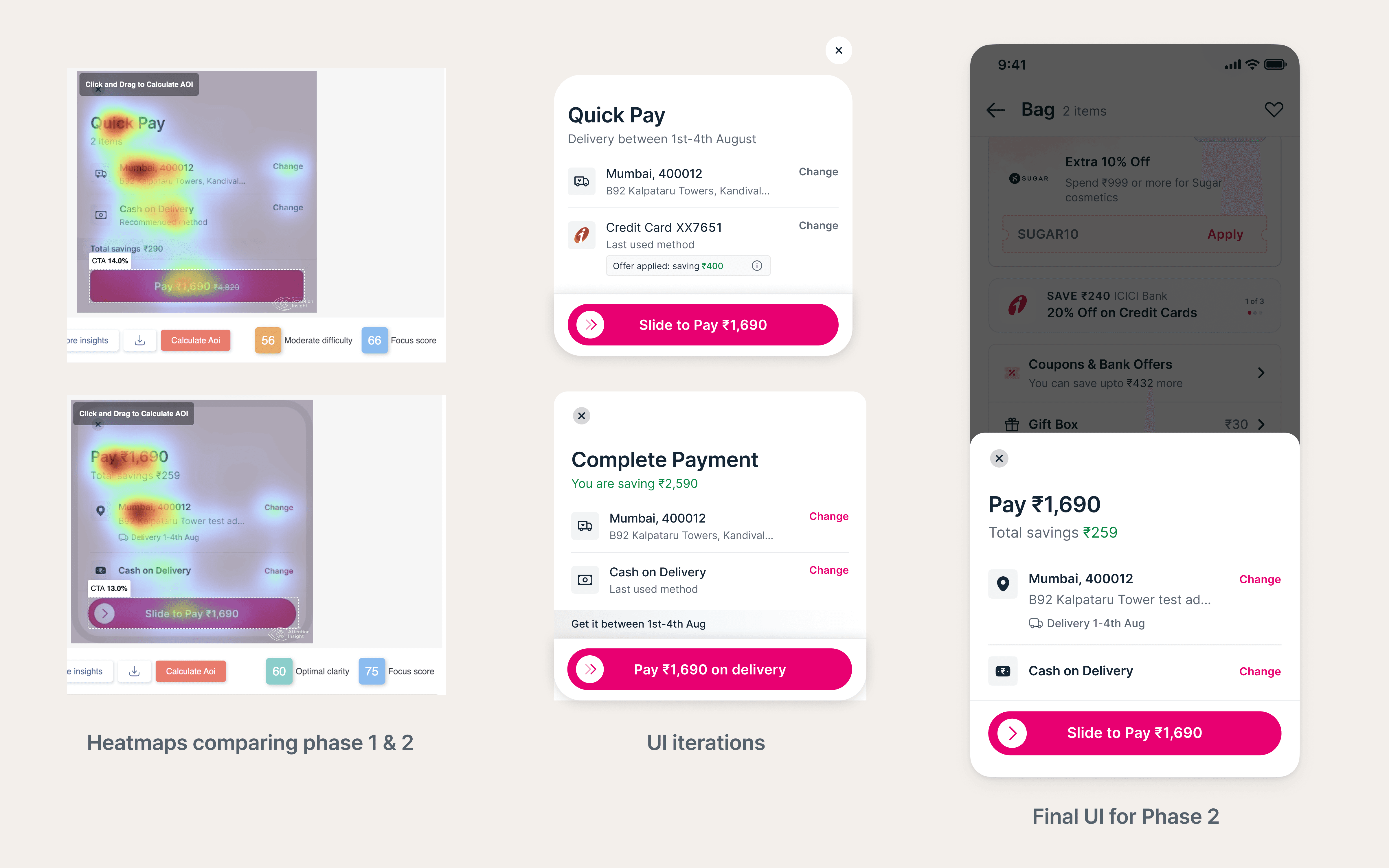 The final design led to an 80 bps increase in checkout-to-order conversion among repeat users, validating that a faster yet reassuring checkout experience drives better results. The feature’s annualised revenue impact is estimated at approximately ₹48 crore.